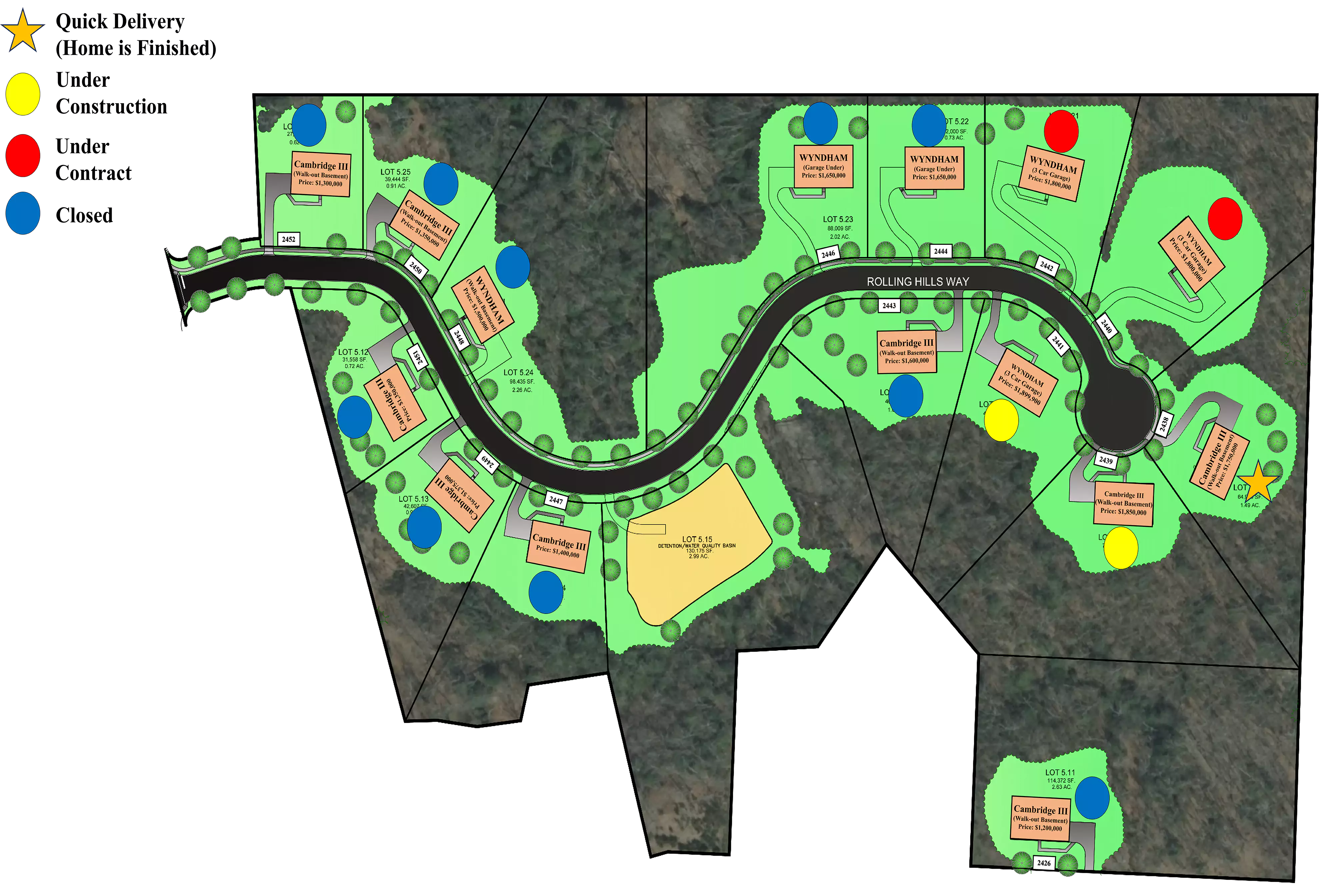 Jan 30th Update: Rolling Hills is almost sold out! We currently only have 3 available lots left! 2438 is QUICK Delivery! Home is finished! 2439, the foundation is dropping Feb 5th. Completion is projected by Fall 2024. 2441, we are close to obtaining permit. Completion projected by end of 2024.